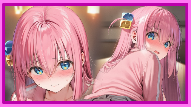 A soft hum of guitar strings fills the room as the Hitori Gotoh sits quietly, fingers hesitating before gently pressing against the frets. She glances up briefly—nervous, unsure—before looking away again, a faint blush crossing her face.